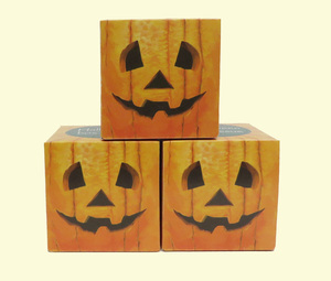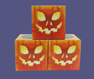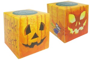 ハロウィンサイコロボックスティッシュ30W 価格:121円(税込) 商品サイズ:80×80×80(H)mm 原紙サイズ:200×208mm 商品重量:40g 1梱包:100個入り 段ボールサイズ:410×410×330mm リバーシブルで表情が変わります。 重ねて積むと簡単ディスプレイに! ポストカードサイズのハロウィンボックスティッシュ25W 価格:110円(税込) 商品サイズ:105×155×35mm 商品重量:60g 1梱包:100個入り 段ボールサイズ:550×320×375mm